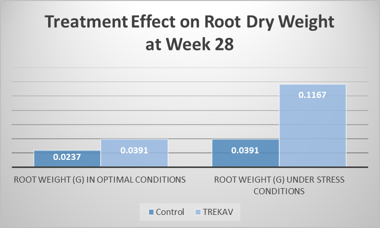Testing was also conducted at the University of Florida with a significant difference shown in total root wait after 28 days. Application of TREKAV resulted in a 165% increase in root weight in optimal conditions and an almost 300% in stressed conditions.