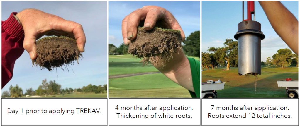 Field trial at Berkley Hall 2020-2021 with Tim King showed root growth from 3.5 inches to 9 inches within 5 months of using TREKAV. The 12th green, in December and January, gets only 3 hours of sunlight. In previous years, the green was thin and there was visible loss of turf. After starting to use TREKAV in December 2020, January 2021 was the first year that Tim saw NO thinning or turf loss on the green, a clear sign of stress relief.